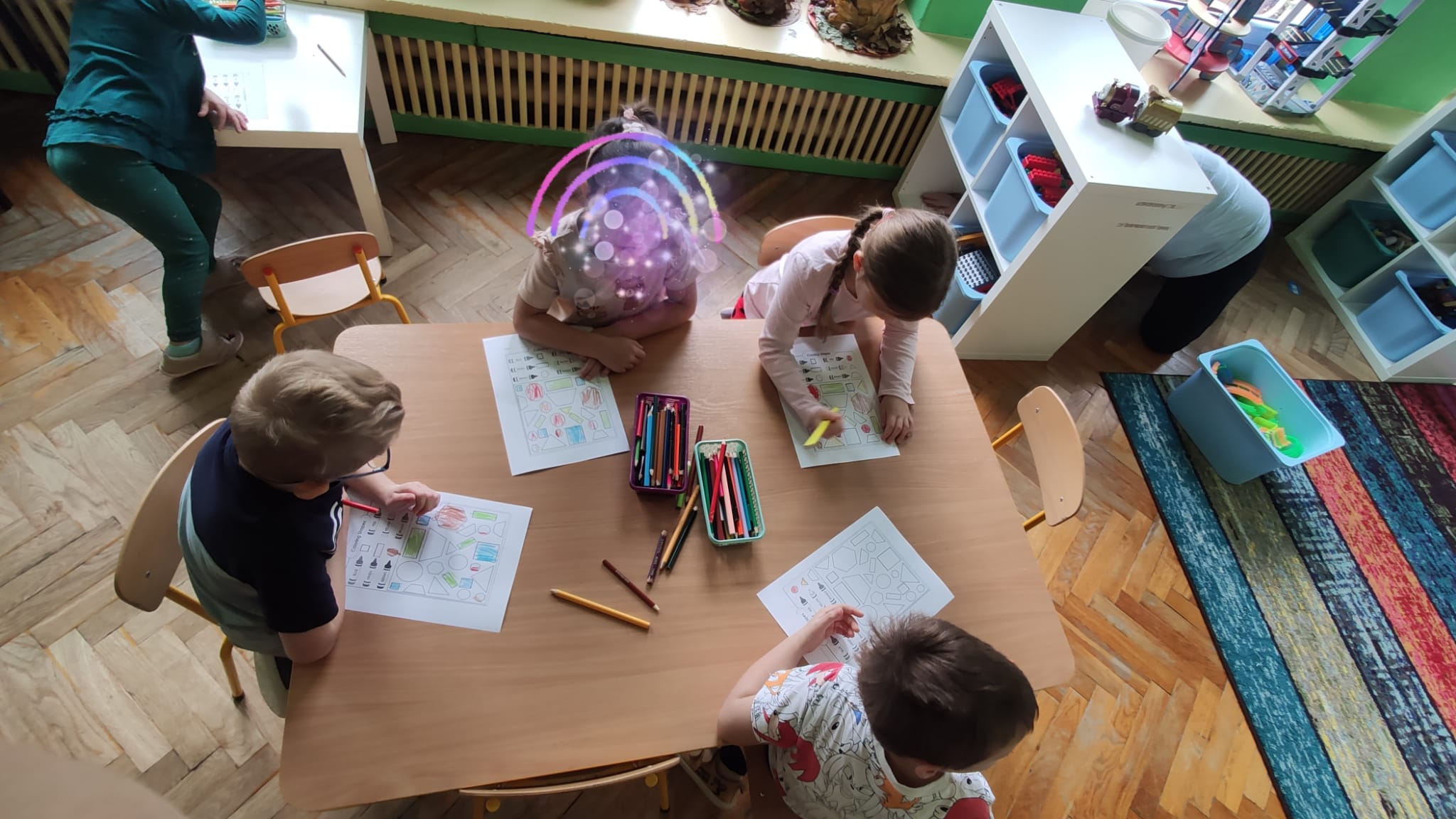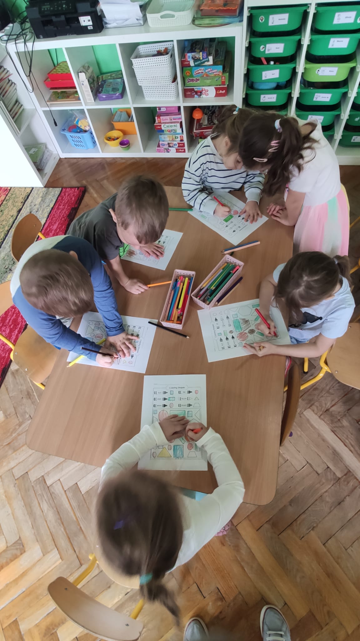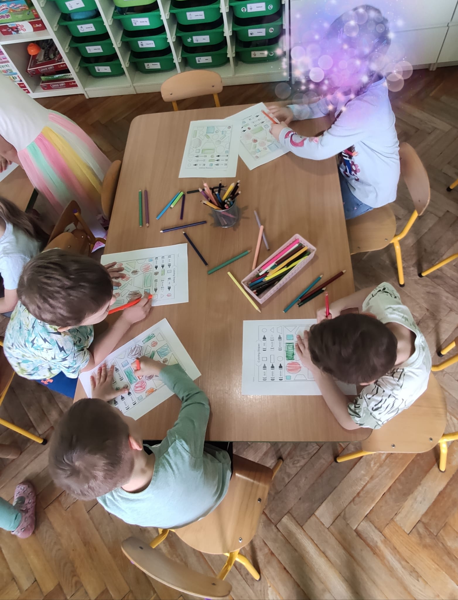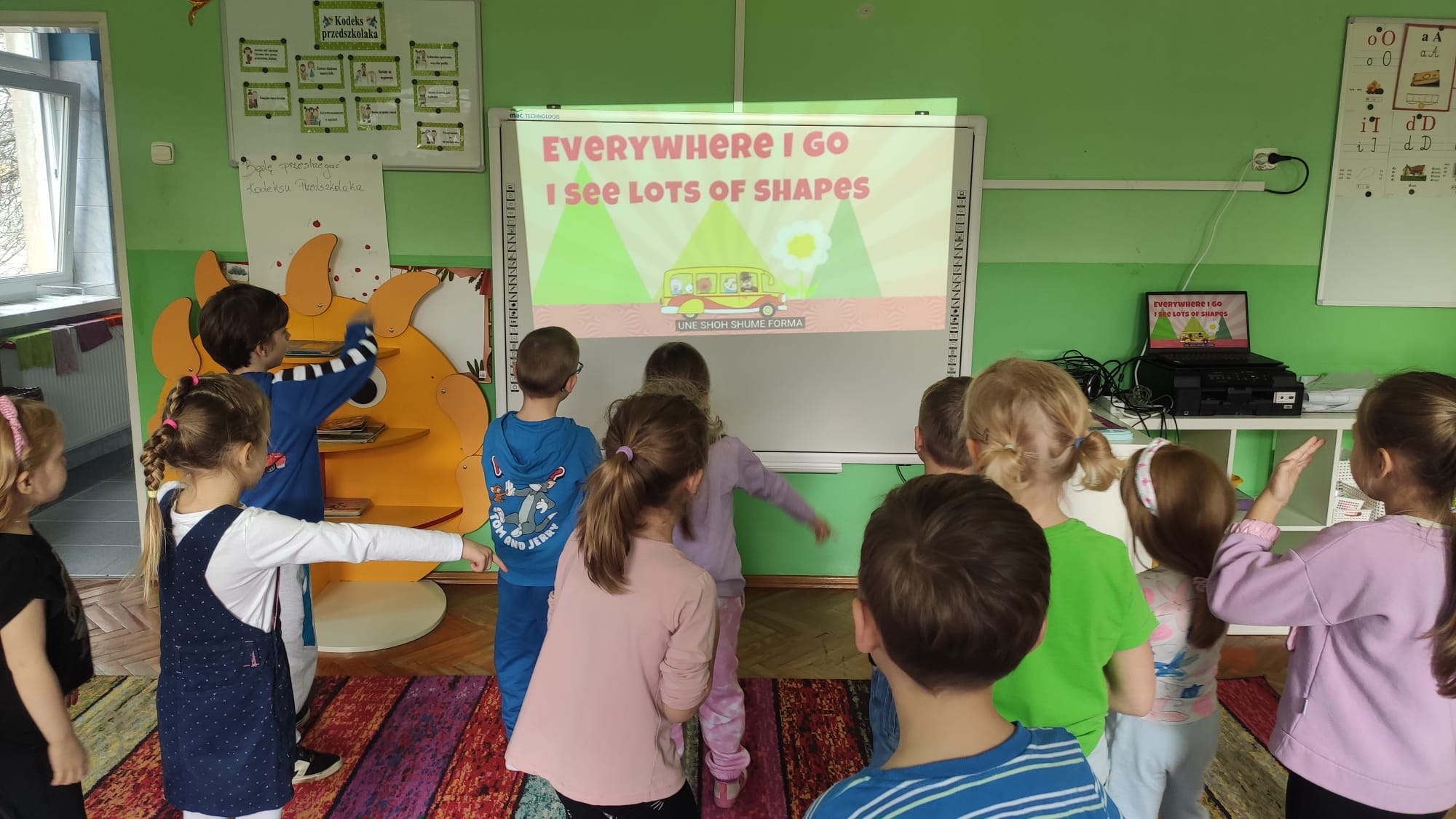 Colours and shapes around us - Kolory i kształty w języku angielskim! Dziś nasze przedszkolaki przeniosły się w kolorowy świat tęczy! Podczas zajęć z języka angielskiego poznawaliśmy i utrwalaliśmy nazwy kolorów i kształtów, śpiewając wesołe piosenki “Rainbow Colours” , “What’s your favourite colour?” i "Shapes are everywhere". Dzieci z entuzjazmem uczestniczyły w grze “Find something…”, szukając w sali przedmiotów w różnych kolorach – było dużo ruchu, śmiechu i wspólnej zabawy! Na zakończenie każdy przedszkolak stworzył własne kolorowe dzieło, malując kształty 2D i 3D według poleceń po angielsku. Podczas zajęć dzieci: rozpoznawały i nazywały podstawowe kolory (red, blue, yellow, green, orange, pink, purple, black, white), rozpoznawały i nazywały kształty (circle, square, triangle, rectangle, star, heart), rozumiały i reagowały na proste polecenia nauczyciela (“Show me a red circle”, “Touch something blue”), uczestniczyły w zabawach ruchowych i muzycznych związanych z tematyką zajęć. Zajęcia były pełne radości, nauki i kreatywnej zabawy – bo kolory najlepiej poznaje się wszystkimi zmysłami!