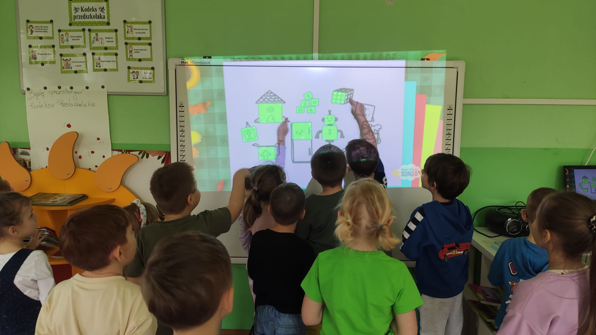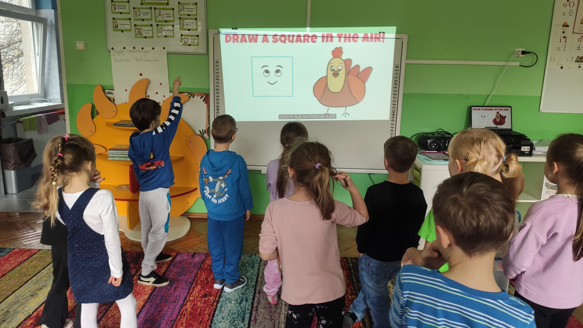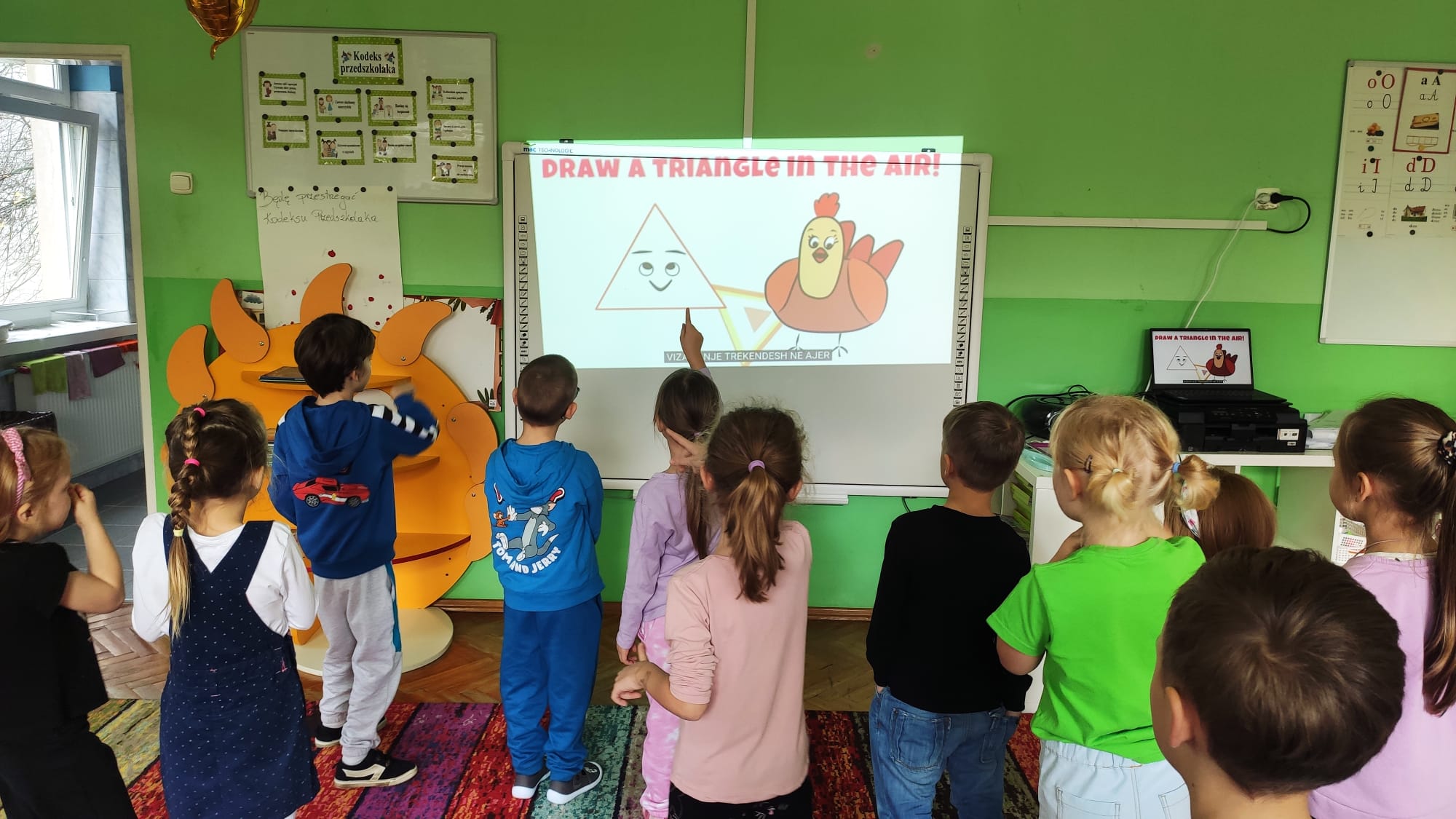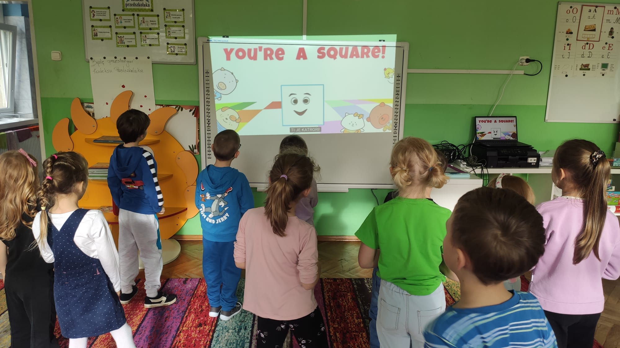 Colours and shapes around us - Kolory i kształty w języku angielskim! Dziś nasze przedszkolaki przeniosły się w kolorowy świat tęczy! Podczas zajęć z języka angielskiego poznawaliśmy i utrwalaliśmy nazwy kolorów i kształtów, śpiewając wesołe piosenki “Rainbow Colours” , “What’s your favourite colour?” i "Shapes are everywhere". Dzieci z entuzjazmem uczestniczyły w grze “Find something…”, szukając w sali przedmiotów w różnych kolorach – było dużo ruchu, śmiechu i wspólnej zabawy! Na zakończenie każdy przedszkolak stworzył własne kolorowe dzieło, malując kształty 2D i 3D według poleceń po angielsku. Podczas zajęć dzieci: rozpoznawały i nazywały podstawowe kolory (red, blue, yellow, green, orange, pink, purple, black, white), rozpoznawały i nazywały kształty (circle, square, triangle, rectangle, star, heart), rozumiały i reagowały na proste polecenia nauczyciela (“Show me a red circle”, “Touch something blue”), uczestniczyły w zabawach ruchowych i muzycznych związanych z tematyką zajęć. Zajęcia były pełne radości, nauki i kreatywnej zabawy – bo kolory najlepiej poznaje się wszystkimi zmysłami!