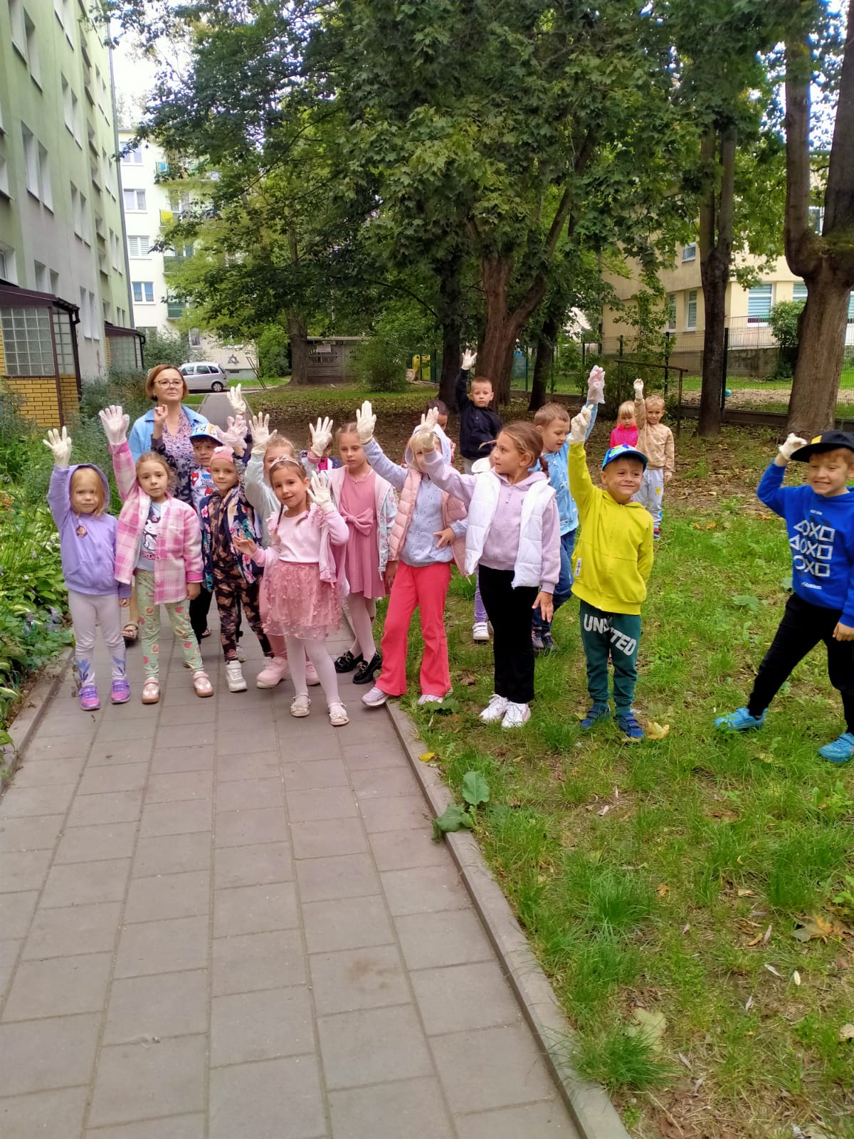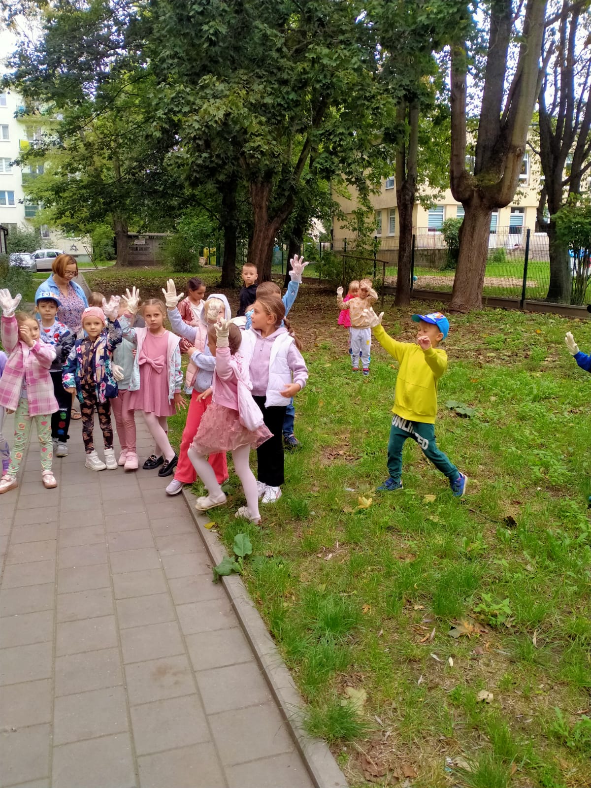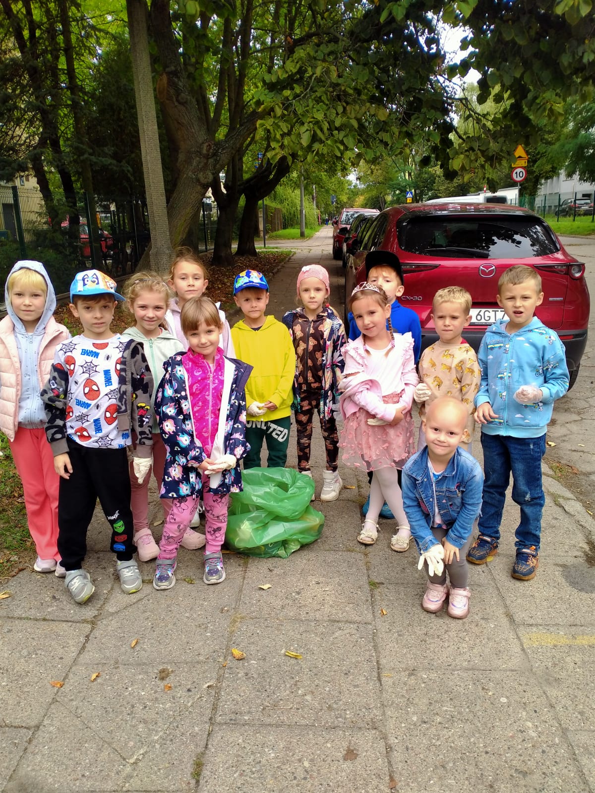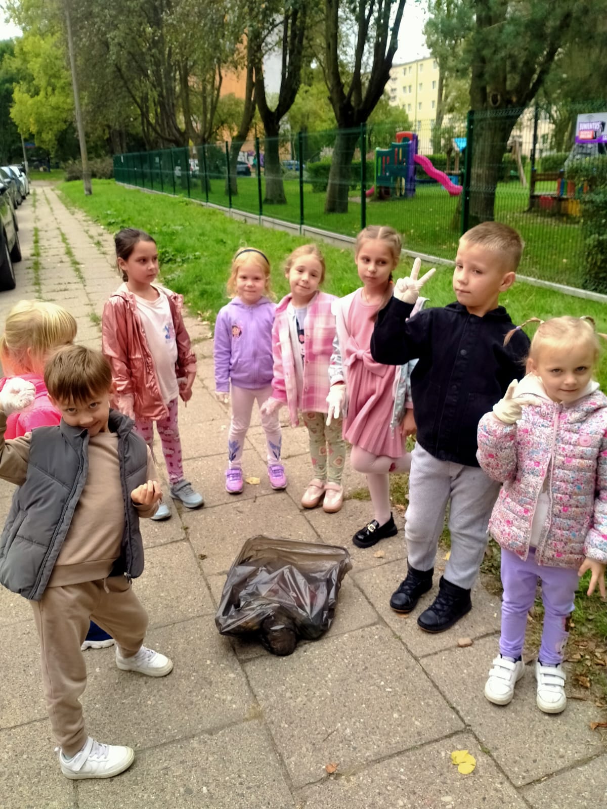Dzieci  z grupy Sowy sprzątały teren wokół przedszkola.